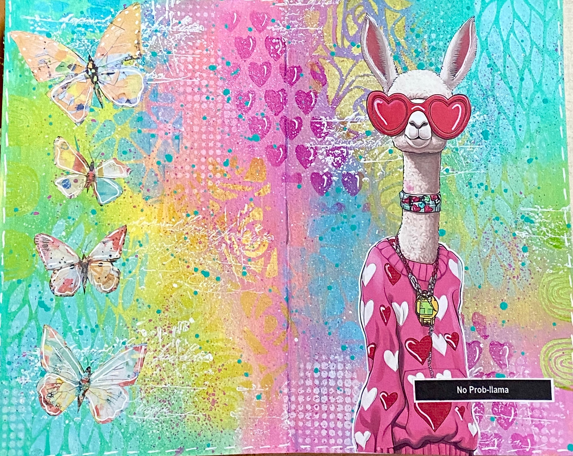 What a fun little page this was! LuLu Llama is a perfect image to use on the blended background. I will show you how I paint with a wet wipe and use stencils to create a blended background with fun layers of texture. I stamped with a script stamp using acrylic paint and doodled with a white gel pen for special effects. Hope you can watch the demo while I play!